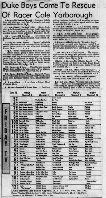We're up to 1980 and I've included the capsules of the shows too. I know I would have probably watched the Dukes of Hazzard rerun where they meet Cale Yarborough if I wasn't going roller skating on that night. Mike Douglas has vanquished Dinah Shore and only his 90 minute long talk show remains. The Incredible Hulk is also on CBS on this night. Dallas was well on its way to becoming a phenomenon, but The Prisoner was airing on WDCN Channel 8 public television and I would watch it without understanding much of it back then.