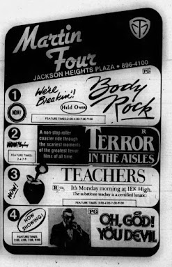 Here's what played at the Martin Four located at Jackson Heights Shopping Center, Murfreesboro, Tennessee from July 1984 through December 1984. The ads come from the Daily News Journal. Some trailers thrown in for good measure. Some of the ads this time are really bad quality. Not much I can do about that.