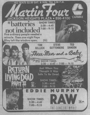 Here's what played at the Martin Four located at Jackson Heights Shopping Center, Murfreesboro, Tennessee from January 1988 through March 1988. The ads come from the Daily News Journal. Some trailers thrown in for good measure. The theatre would expand to 6 screens at the on March 25, 1988 . While Carmike had owned the chain for some time it had still used the Martin name, but not any longer. I am ending my series on the Martin in Murfreesboro with this post.