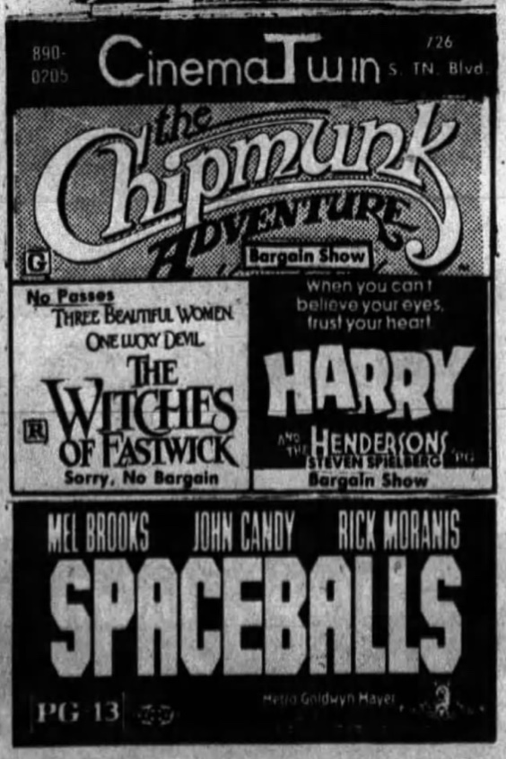 Here's what played at the Cinema Twin located at 726 S. Tennessee Blvd in Murfreesboro, Tennessee from July 1987 through December 1987. The ads come from the Daily News Journal.